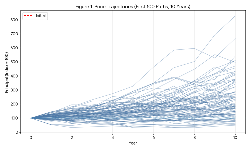 右肩上がりの軌跡を描くシナリオが大半を占める一方で、赤の点線で示した元本100を下回って推移するシナリオも一定数存在しており、市場リスクが顕在化した場合の停滞局面が読み取れる。つまり、「10年という期間は、運が悪ければ元本割れで終わる可能性が十分にある」という市場の不確実性を視覚的に表している。