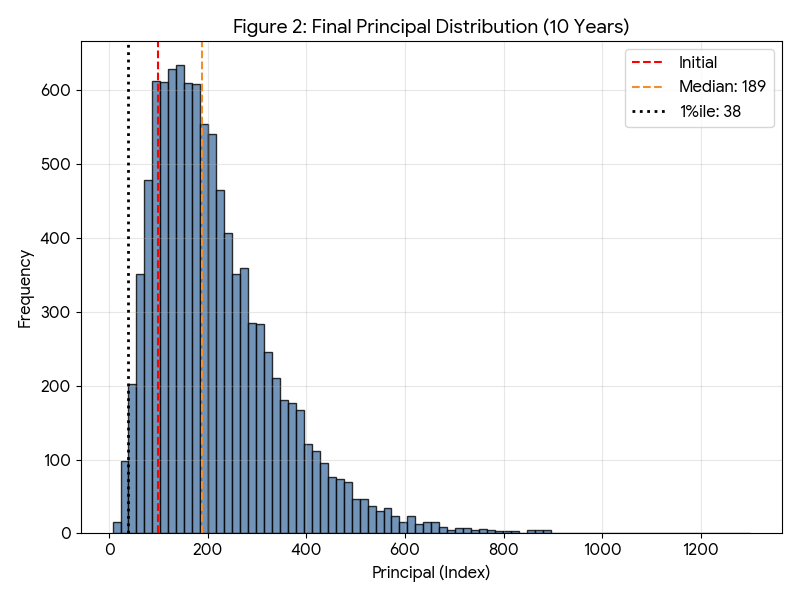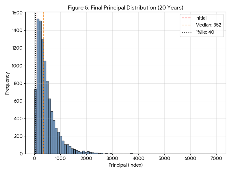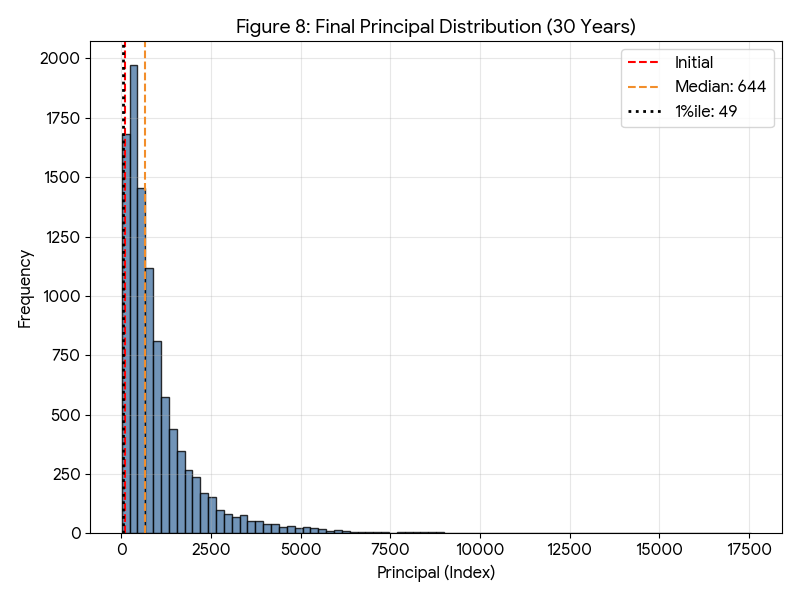 図8の30年後の元本分布を見ると、中央値は644(約6.4倍)という強力な資産成長を示している。下位10%点においても「156」まで上昇しており、通常の不況サイクルであれば十分なバッファを確保できていると言える。しかし、特筆すべきは下位1%点が「49」に留まっている点である。30年という長い時間を費やしても、運悪く歴史的な大暴落が重なる稀有なシナリオにおいては、資産が半減した状態で終わるリスクが残存している。すなわち、S&P 500への集中投資において、「時間をかければ全てのリスクが消える」という通説は、この「消えない1%」に対しては成立しないことが、統計データから明らかとなった。