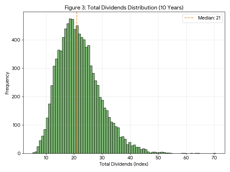 ここまでは配当を無視した基準価格のみでの議論であったが、10年間の受取配当総額分布 (Total Dividends Distribution)を図3に示す。横軸が受取配当の総額、オレンジ破線が中央値である。ここで採用した年率1.5%の配当利回りの場合、10年間の累積配当額の中央値は 21 であり、元本の2割相当に留まる。図2で確認された元本変動リスク(下位1%シナリオでの損失幅が-62ポイント)と比較すると、この配当収入は損失を補填するには不十分であることが読み取れる。すなわち、「投資期間10年程度では、インカムゲインの蓄積効果によるダウンサイドリスクの相殺は限定的である」という傾向が示されている。