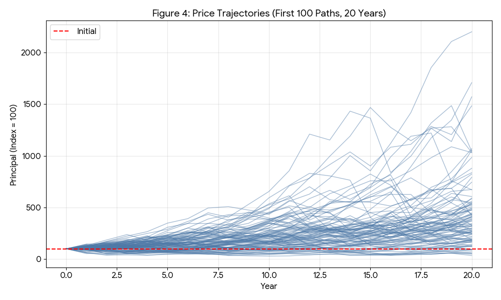 最後に、老後資金形成等を想定した30年における検証結果を確認する。図7の価格推移(30年間)においては、結果の二極化が極限まで進行している。成功シナリオ群は指数関数的な伸びを示し、資産が数十倍になるケースも珍しくない。その一方で、図の下部には地を這うようなラインが残り続けており、30年という超長期であっても市場低迷から脱却できない世界線が存在することを示している。