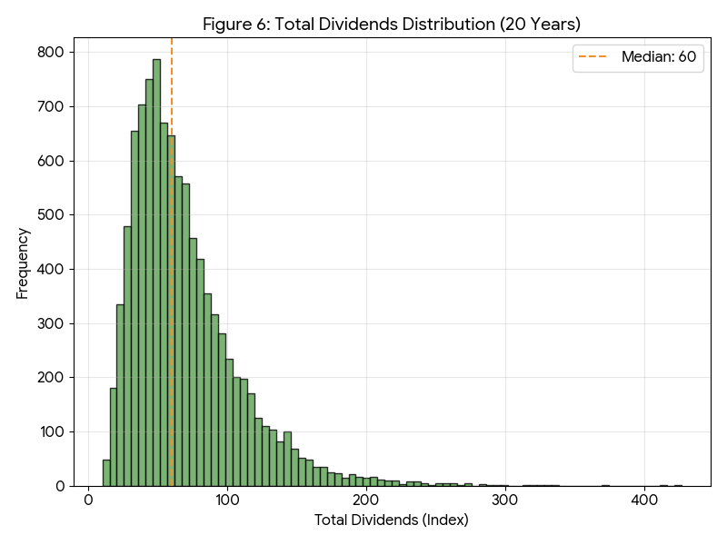 20年間の受取配当総額分布を図6に示す。期間の伸長に伴い、累積配当額の中央値は 60 まで拡大する。これは元本の6割に相当する水準である。図5で見た下位1%シナリオにおける元本は 40(損失幅 -60ポイント)であったことを想起すると、この配当収入(+60)は、計算上その評価損をほぼ相殺し得る規模に達している。すなわち、20年という期間を経ることで、インカムゲインが資産全体のダウンサイド耐性を実質的に補完し始めていることが読み取れる。