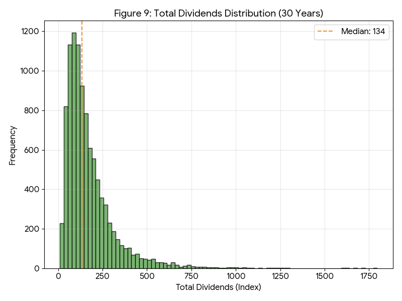 最後に、30年間の受取配当総額分布を図9に示す。ここに至ると期間の蓄積により、累積配当額の中央値は 134 に達し、ついに投資元本を超過する。これは、仮に30年後の株価が暴落し、元本が図8の下位1%シナリオ(49)のように半減していたとしても、受取配当を含めたトータルリターンではプラス(49 + 134 = 183)を確保できることを意味する。すなわち、「超長期投資においては、インカムゲインの累積が強固なセーフティネットとなり、価格変動リスクを凌駕する成果をもたらす」という結論が導き出される。