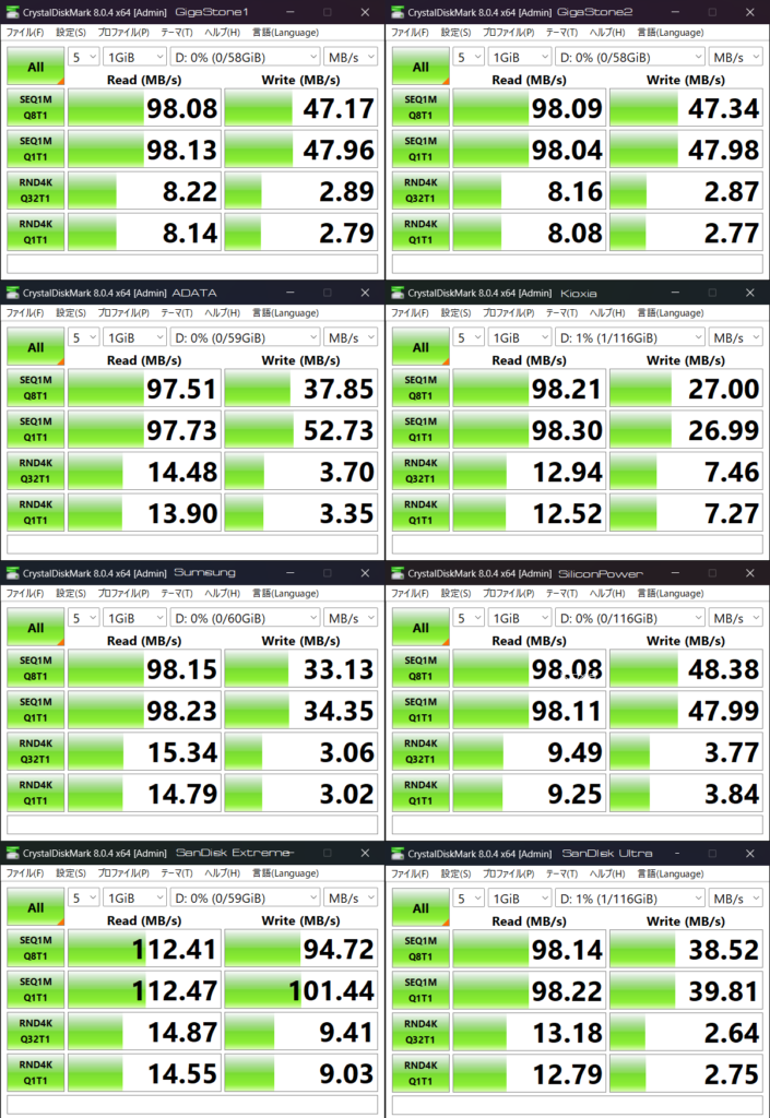 これらのカードを、MS-Windows環境下における定番ベンチマークソフトウェア、CrystalDiskMarkを用いて試験した。