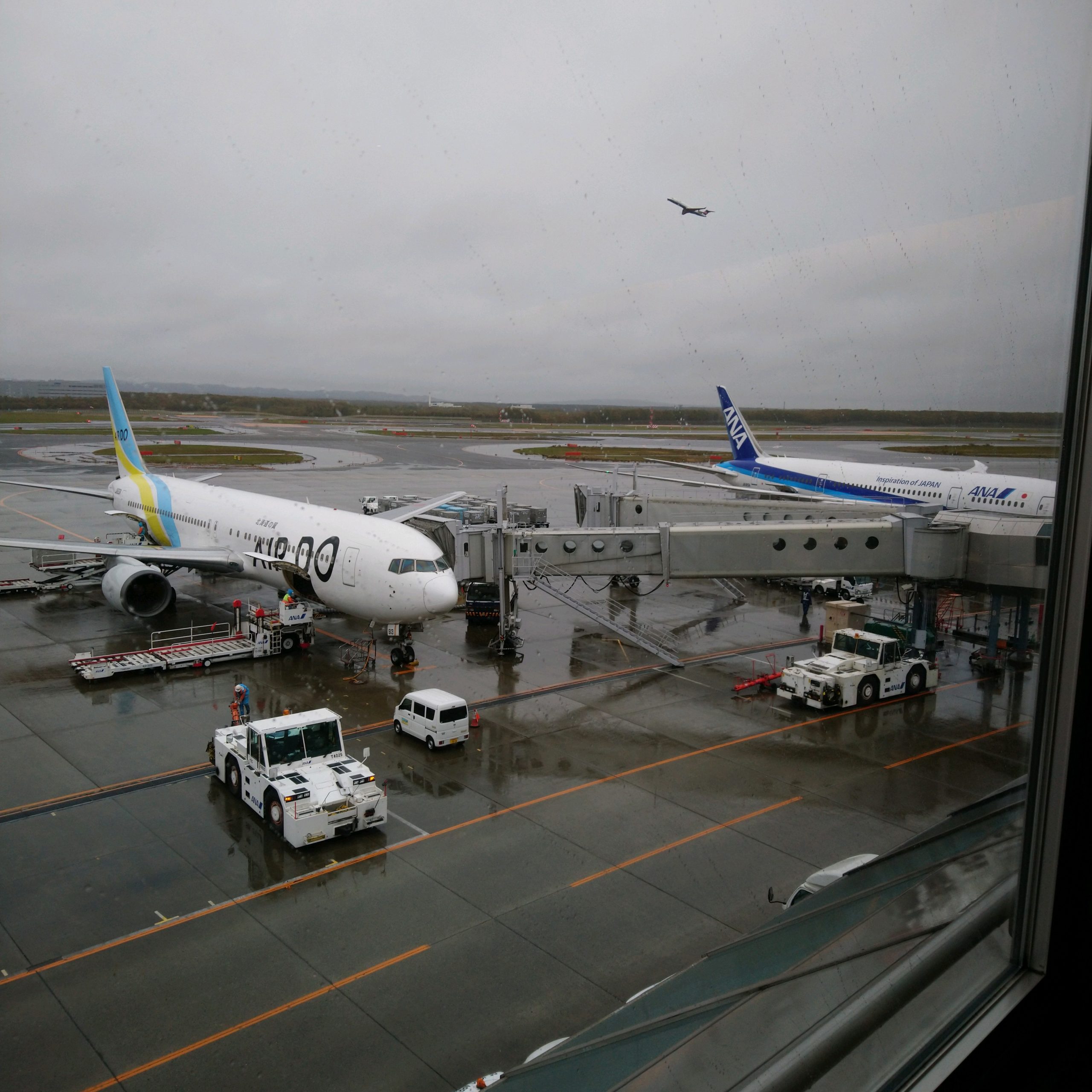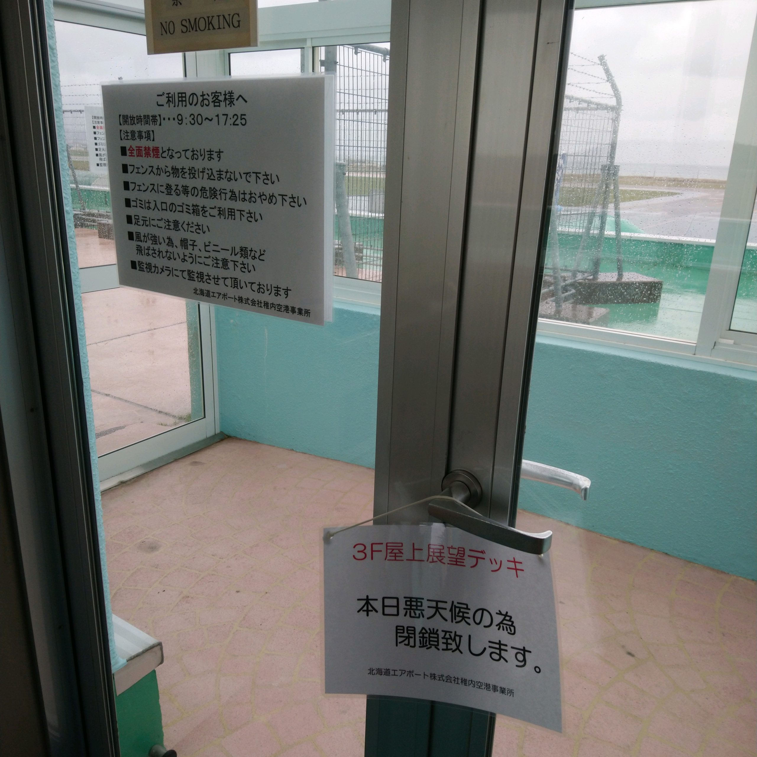 3日目は、日本最北の空港である稚内アウトアンドリターン。稚内空港はANAしか就航していない小さな空港。グランドスタッフさんが地元っぽい人達で、ある意味見慣れたANAっぽくなくて新鮮だった。最北端空港の展望台からはどんな景色が見られるのだろうと期待しつつ降り立った稚内であるが、¡なんと大雨だった! 展望台も写真の通り閉鎖。これはこれで面白かったけどね。機内から雲海と青空を眺め、機内食を食べながら帰りました。