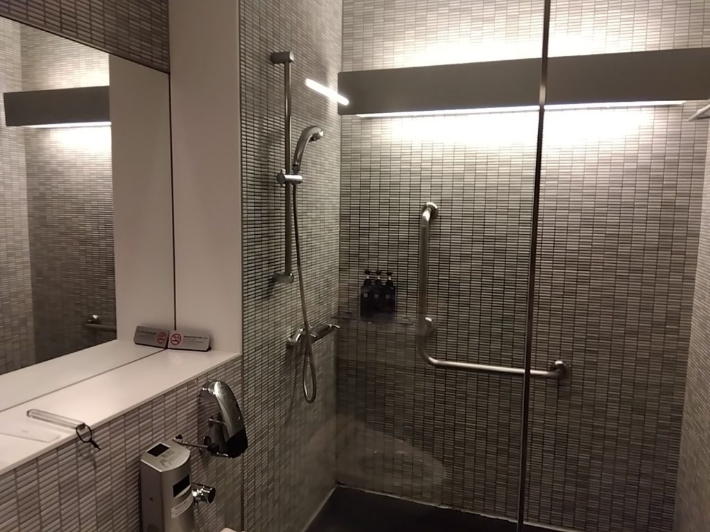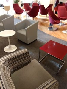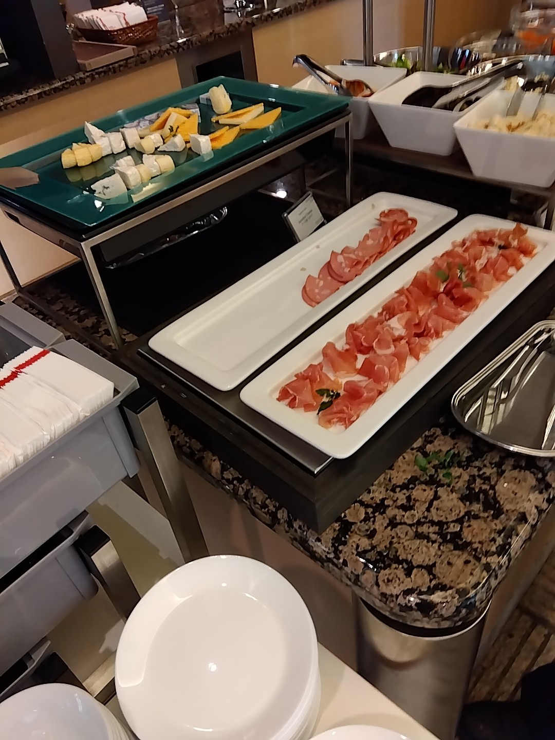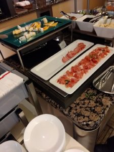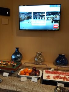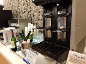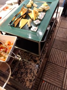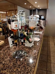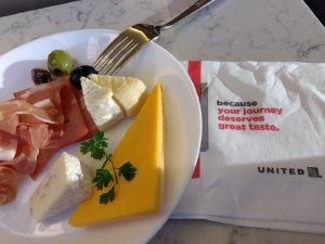 次はユナイテッド航空のラウンジ、ユナイテッドクラブ。ユナイテッド航空はスターアライアンスメンバーなので、スーパフライヤーズカード(SFC)で入れる。こちらは広く、アメリカ系なので当然のことながら西洋食が充実している。とはいえ日本なのでお稲荷さんとかカップ麺とかもある。僕は当然生ハムとチーズ盛り合わせとオリーブをぽりぽりパクパク。残念ながらノンアルコールビールは、ない。。。