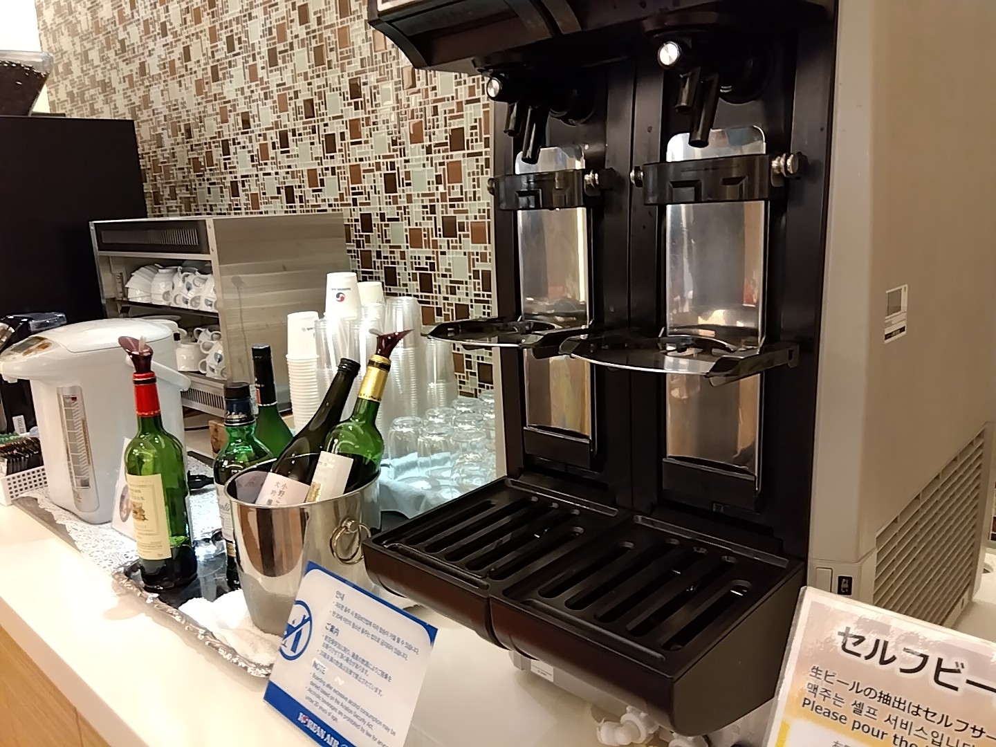 そこを抜けると制限エリア。この中にある4つのラウンジ、ANA, ANA Suite, UAL, KALを巡る。先ずはKAL コリアンエアーの、プライオリティパスで入れるラウンジ。受付で「ビジネスクラスなんだからANAラウンジの方がイイよ」と言われ意表を突かれるが、「色々まわってるのよー」といって侵入成功。まぁ言うだけのことはあって、かなり小ぶりではある。