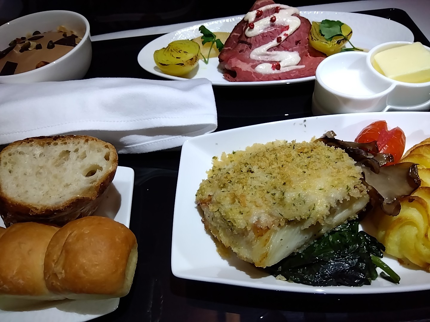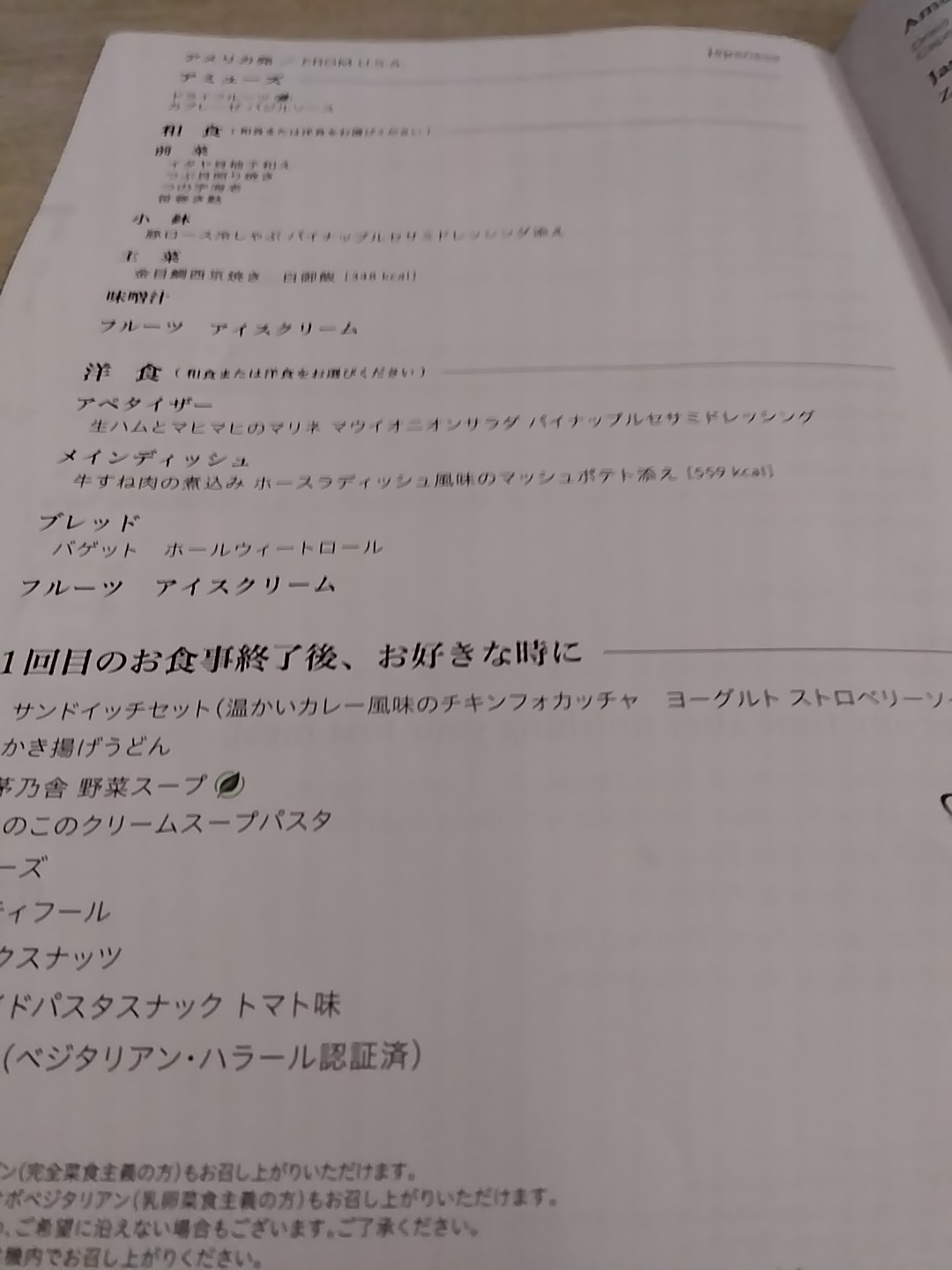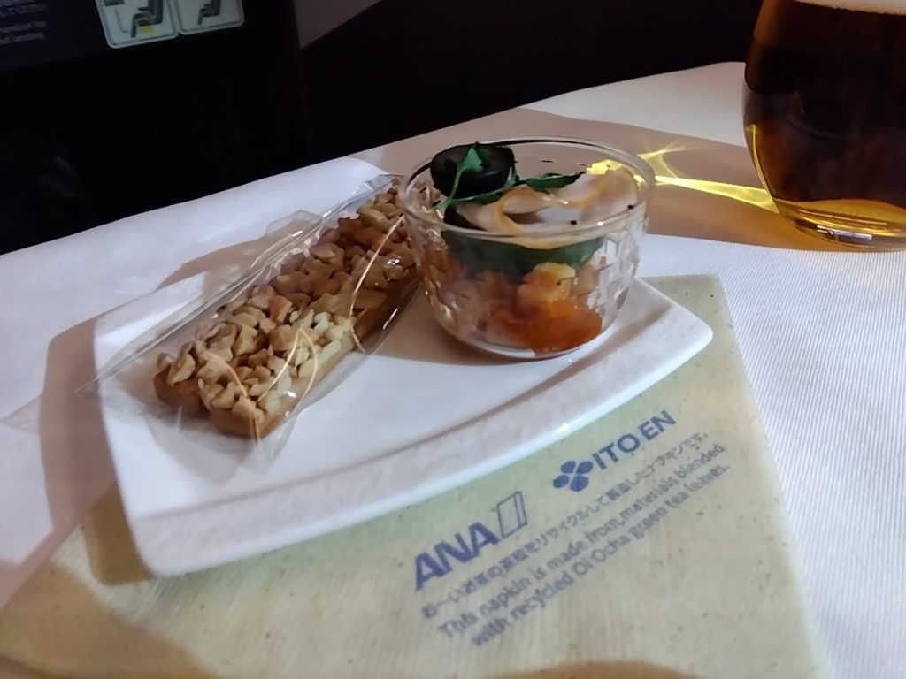 まずはウェルカムシャンパンが配られるだけど、飲まない僕の選択肢はオレンジジュース…ここでもぜひノンアルコールビールを出して欲しい! 離陸するとさっそく美味しいお食事だけど、ここで初めてノンアルビールにありつけるのであった。。。