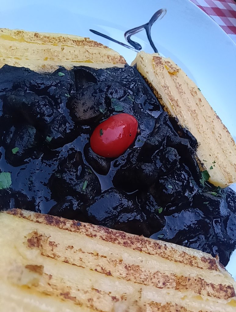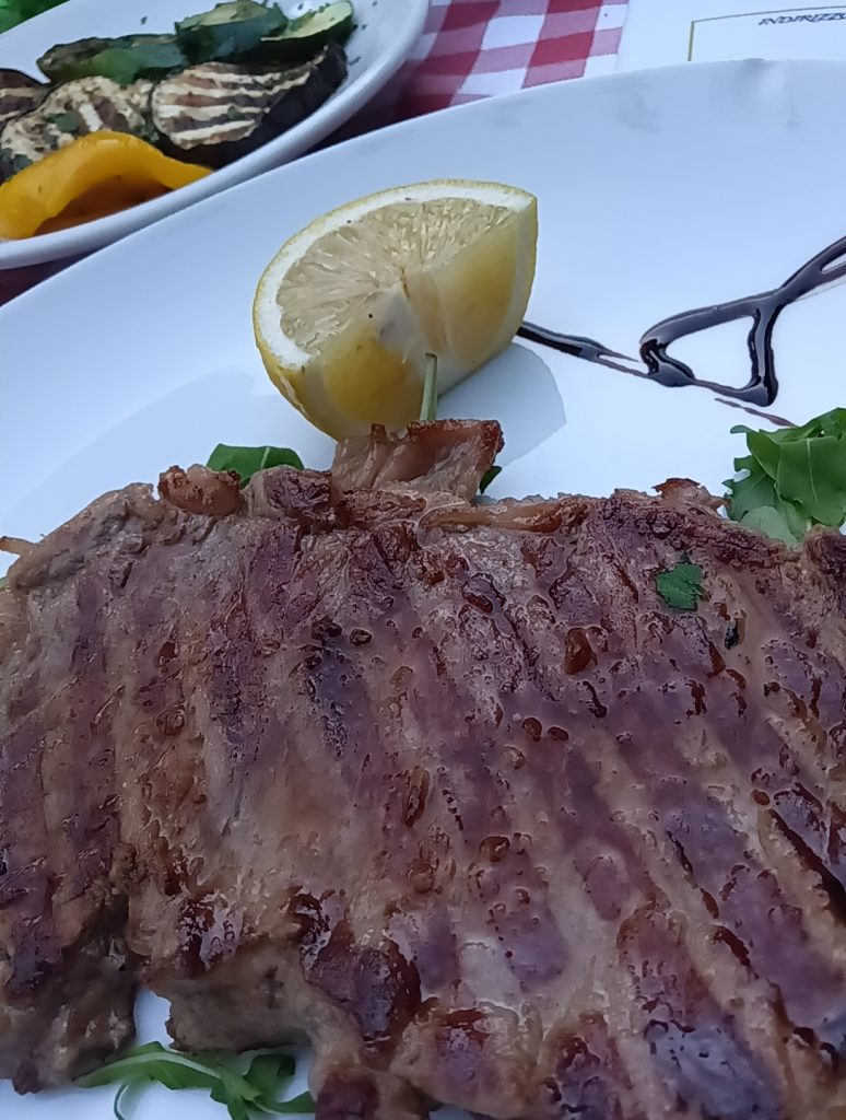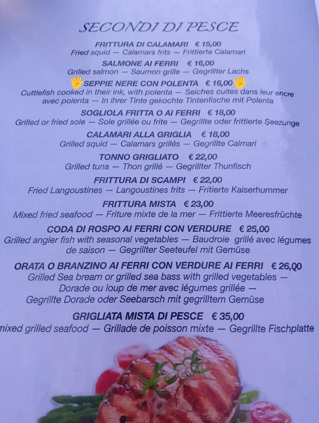 ミラノ風カツレツに心惹かれつつも先ずはシンプルに Bistecca di manzo ai ferri、牛ステーキのグリル。どうやら定番らしい付け合わせ野菜のミックスグリル Verdure miste grigliate。うーん、茄子 ベネチアの秋。そして名物スミイカイカスミのポレンタ添え Seppie nere con polenta。Polentaはトウモロコシ粉を煮詰めたモノで、Seppie nere に関してはこちらに詳しいようです。