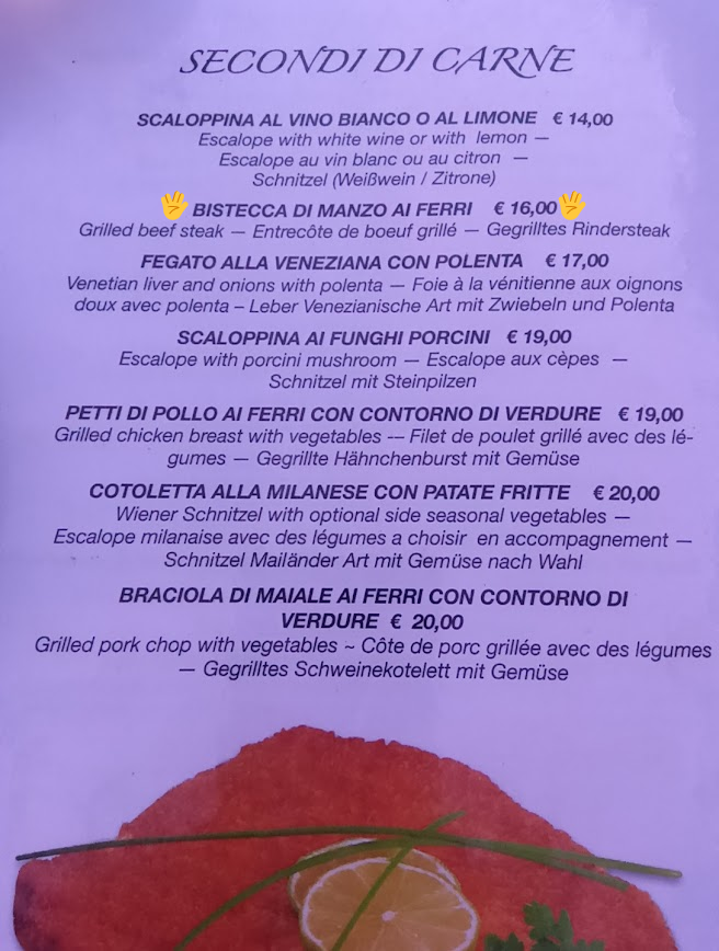 そもそもイタリアは何処で何を食べても美味しい、は言い過ぎにしても、やっぱり結構どこも美味しい。とはいえベネチアはベタな観光地だ、と実はあまり期待していなかった。が、やはり結構どこも美味しかったww ガチガチの観光地ど真ん中では食べなかったせいかもしれない。ちょっとだけ外れたところにイイカンジの店がたくさんある。基本的に高級リストランテには行かない。ほぼ暴言だけど、高級イタリアンなら東京で食べても良いと思ってる。でもオステリアやトラットリアあたりの味や雰囲気は、日本じゃ再現しきれないからねぇ。いや、まぁ、ただ単にお金がないからって話かもしれないけどね。さて、そんな庶民派お食事処をいくつか紹介していきたいと思う。先ずは、